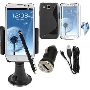 BAAS (TM) Samsung Galaxy S3 i9300 Car Windscreen Suction Mount Holder Cradle Kit With 360° Degree Rotation Feature , Black Stylish S Line Gel Case Cover , USB Data Cable , USB Car Charger , Touch Stylus Pen & Screen Protector Guard best offers
